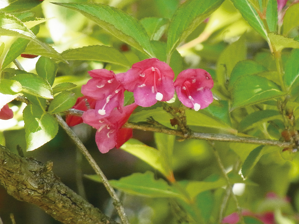 公園などでウツギと名の付く低木は、他に「タニウツギ」(スイカズラ科タニウツギ属)をよく見かけます。枝先や上部の葉腋に桃紅色〜紅色の花を2〜3個付け、花冠は漏斗(ろうと)状でなだらかに広がり、花先は5裂。特に花の色が濃い系統の園芸品種の「ベニウツギ」は、観賞用に庭園や公園などに植栽されています。同じ仲間の「ハコネウツギ」は、花の付き方や形はタニウツギと同じですが、漏斗状の花筒が上半分で急に鐘状に広がります。また、花色が白色から次第に紅色へと変化します。初めから濃紅色の「ベニバナハコネウツギ」や白色が変化しない「シロバナハコネウツギ」もありますが、あまり見かけません。ハコネウツギは箱根の低地に自生することが確認されています。